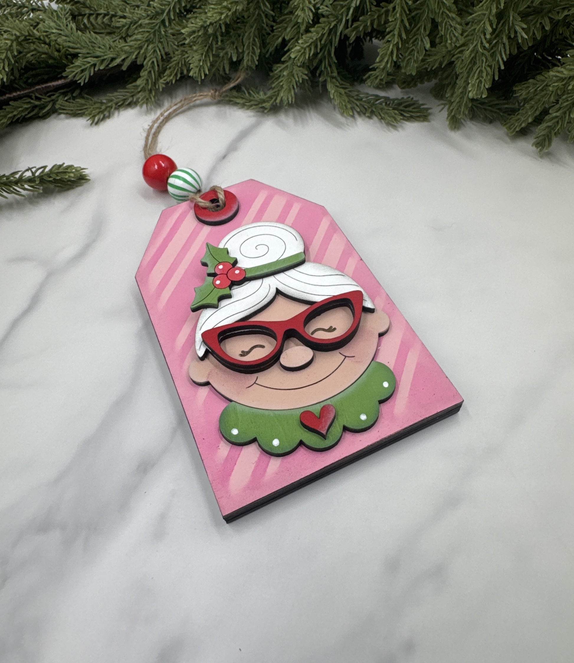 This delightful wooden ornament features Mrs. Claus with her signature white bun, red glasses, rosy cheeks, and a holly accent, all layered over a pink candy-striped background. A twine hanger with festive red and green beads adds a touch of whimsy.