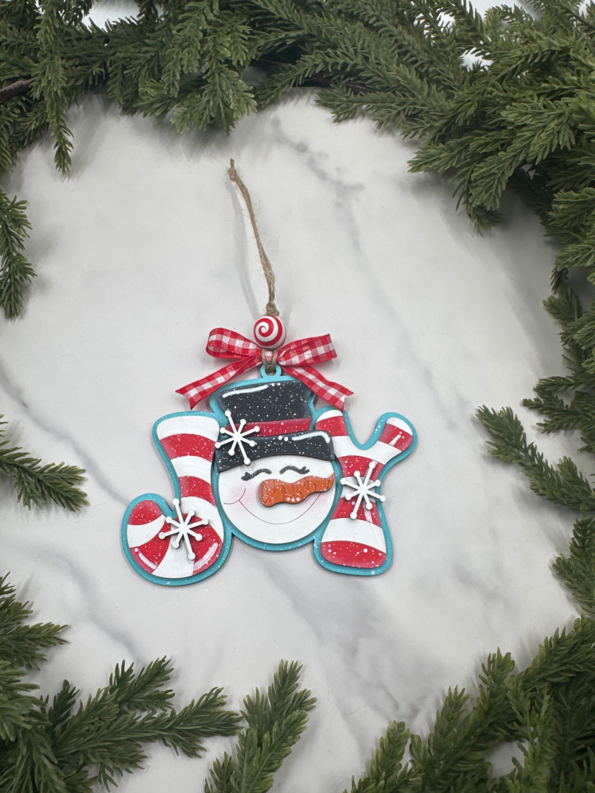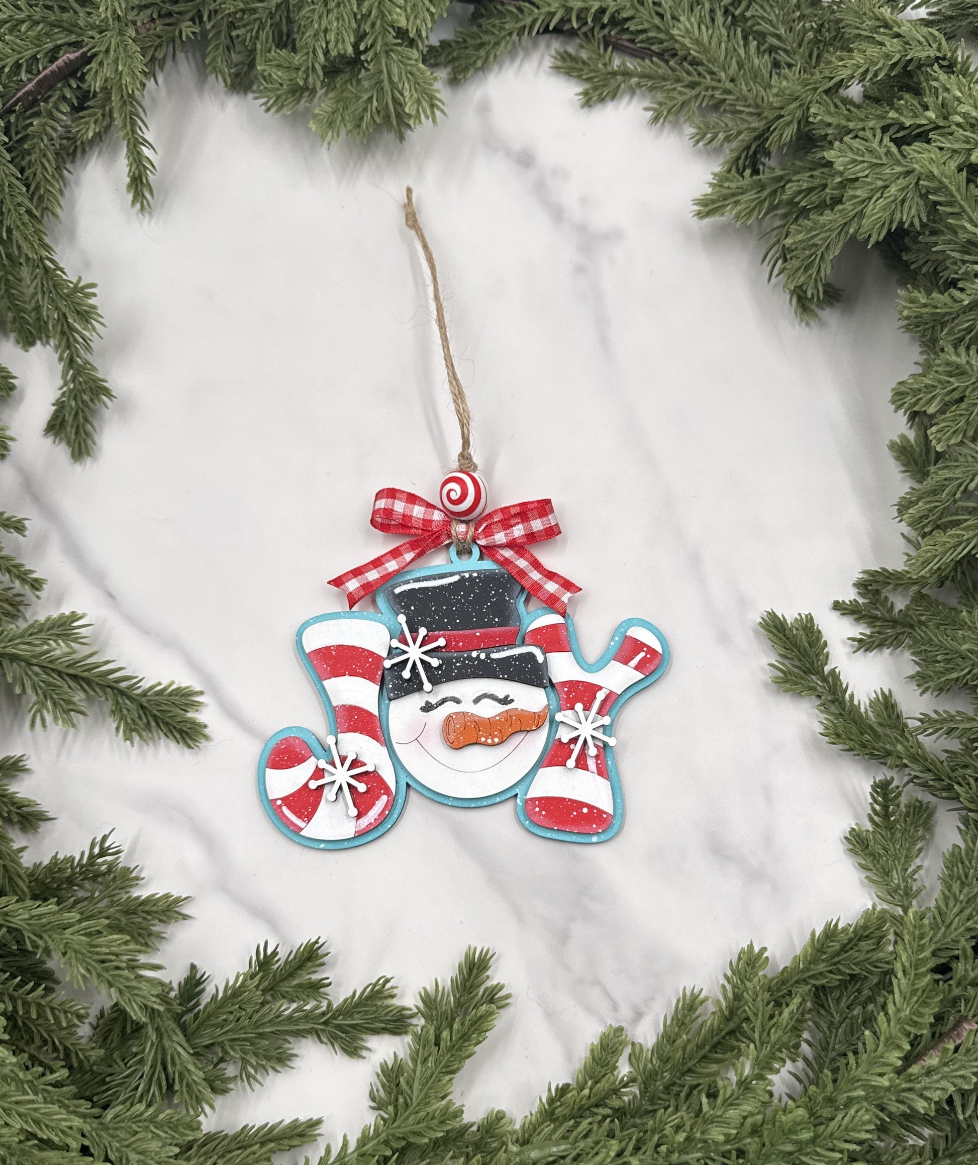 This layered wooden ornament features a jolly snowman face framed by candy cane-striped JOY lettering. Accented with playful snowflakes, a peppermint bead, and a red gingham bow, it captures the fun and whimsy of the Christmas season.