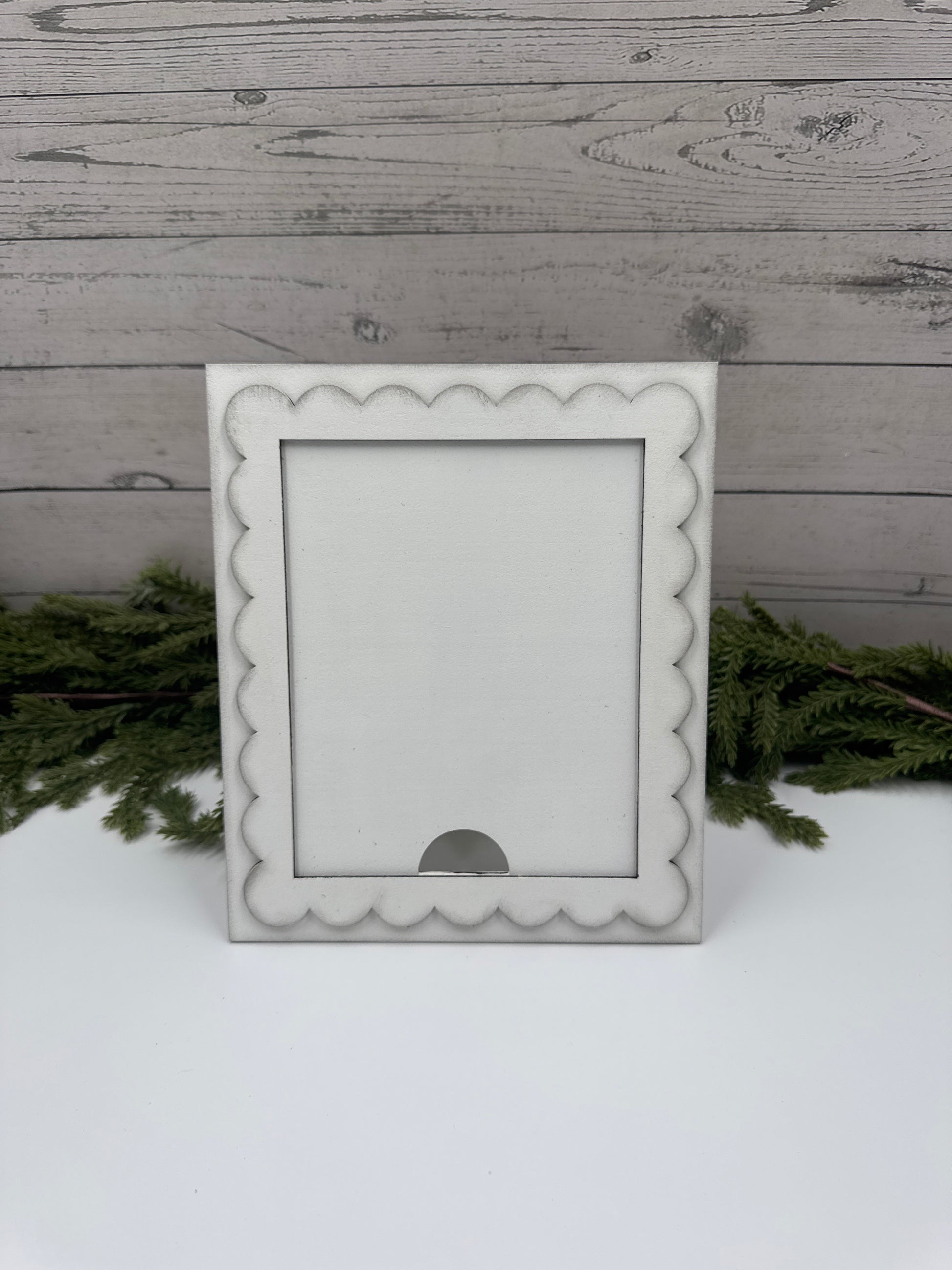Each holder is made from real wood, hand-painted in a soft white finish, and slightly distressed for a timeless farmhouse look. Its scalloped-edge frame adds warmth and texture to any shelf, countertop, or entryway display.